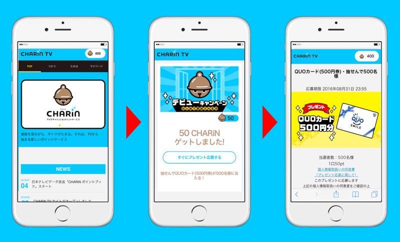 また、サービス本格始動を記念して、「CHARiN デビューキャンペーン」を実施する。CHARiN TVサイトから1日1回ポイントが獲得でき、キャンペーン限定の抽選に応募することができる。また 通常のポイントを利用したプレゼント企画に加え、 キャンペーン期間限定プレゼントとして、 QUOカード(500円券)が抽せんで500名に当たるプレゼントも用意されている。