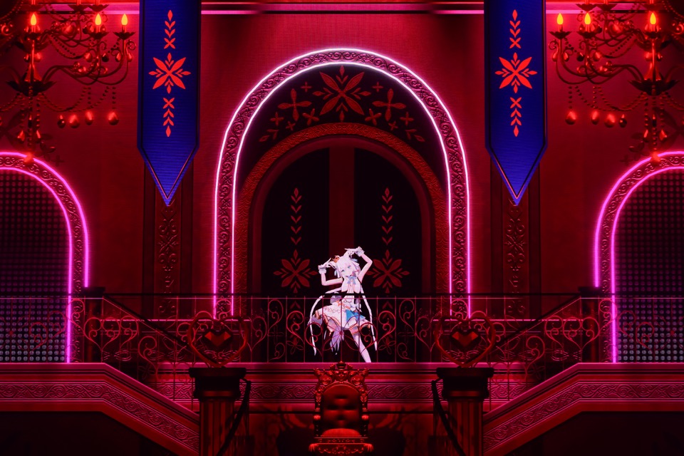ライブはRPG風のオープニングムービーから幕を開けた。ピアノの旋律にのせてアナログタッチのフブキが扉を開くと、ピコピコサウンドが加速し、キービジュアルのフブキが登場。王宮を模したステージには、フブキングダムの腕章をつけたバンド隊も見え、まさに王国の祝祭の開幕を告げた。