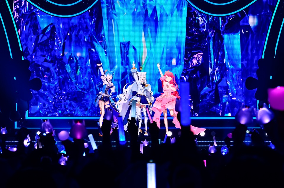 ゲストとして登場したのは、0期生のさくらみこと星街すいせい。3人による「スターライトパレード」では、水色とピンクの光が舞い上がり、幻想的な雰囲気を演出。「クラクラ」ではジャズファンクのリズムに合わせた息の合ったパフォーマンスを見せ、祝祭ムードをさらに盛り上げた。