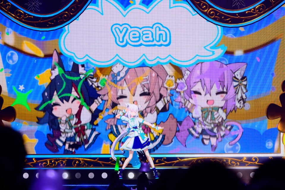 アンコールではライブTシャツ姿で再登場し、「グローエンブレイス」を披露。ホロライブの仲間たちへの想いが込められた楽曲を、力強く歌い上げた。ライブの締めくくりは「えんじょい the わーるど!」。フブキの「すこん部にはいつだって笑顔と楽しさを届けたい」という想いが詰まった新曲で、会場は最後まで一体感に包まれた。