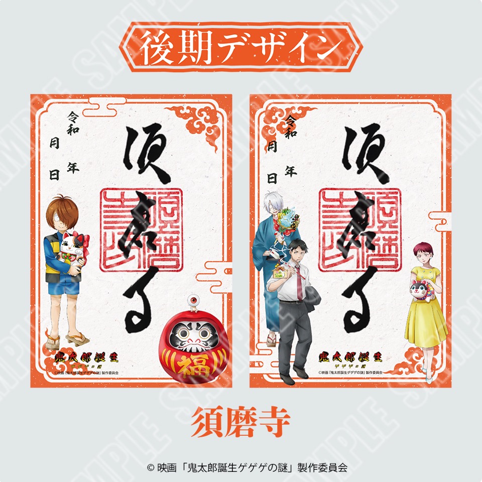 - 御朱印(前後期で各2種) 各1,200円 鬼太郎の父、水木、鬼太郎の母、鬼太郎と目玉おやじが美麗に印刷された特製御朱印。前期と後期でデザインが異なる。 ※妙満寺と須磨寺では授与時に御朱印を記帳。陽運寺と妖怪神社では、あらかじめ御朱印が印刷された台紙での頒布となる。