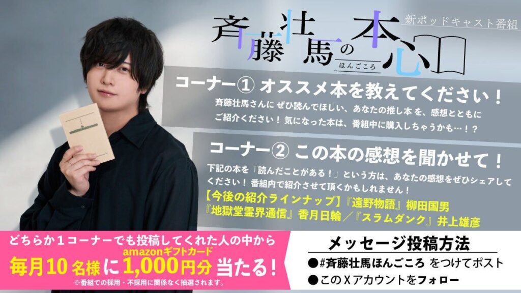 その一冊の本が、斉藤壮馬の人生とどう重なっているのか、声優として、また一人の読者として何を受け取ったのか。番組では、そうしたトークからにじみでる「本心」を届ける。