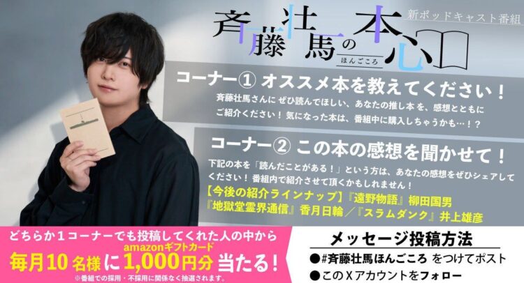ハッシュタグ「#斉藤壮馬ほんごころ」をつけて投稿すると、番組内での採用・不採用に関わらず、抽選で毎月10名にAmazonギフトカード1,000円分が当たる。詳細は番組公式Xで確認できる。