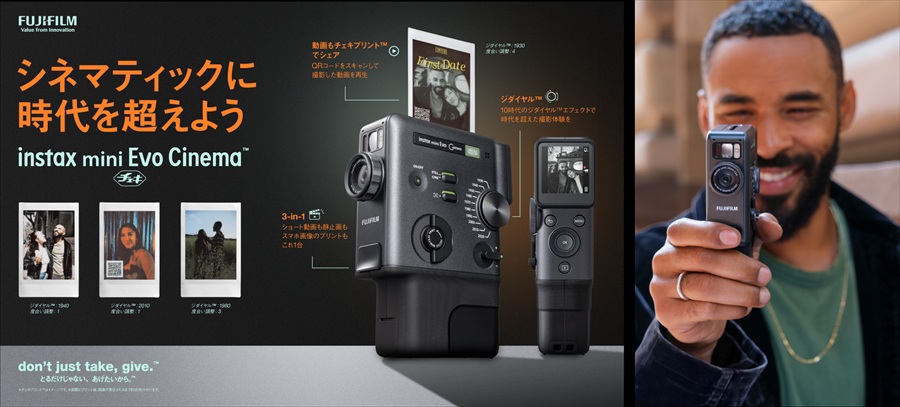 「シネマティックに時代を超えよう」をメッセージに掲げる「instax mini Evo Cinema」。デジタルとアナログ、そして過去と現在をつなぐ新しいインスタントカメラとして、2026年1月30日より発売される。