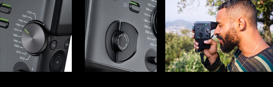 操作系もアナログ感にこだわっており、指先にクリック感が伝わるダイヤルや、フィルム巻き上げのような操作感を楽しめる「プリントレバー」を搭載。また、付属のファインダーアタッチメントやグリップアタッチメントを装着することで、本格的な撮影スタイルにも対応する。